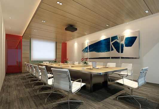 會議區(qū)辦公室裝修采用了進口高級木質板材來做了平面天花和投影背景墻,表達簡單的裝修就是最好的理念,展現高檔辦公室豪華裝修的真是品質,確立它的地位和權威。石膏板加隔音棉的墻身,加強會議室的隔音效果,這是辦公室豪華裝修才有的高級材料。非常高貴大氣的裝修。