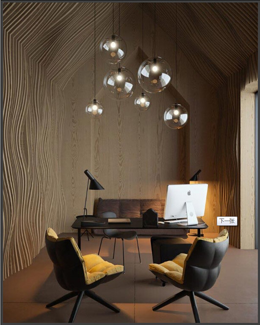 設(shè)計師把這里的吊燈用透明泡泡的玻璃罩來裝飾它的外表,此次辦公室裝修設(shè)計用了邊角料的來美化室內(nèi)的辦公環(huán)境,藝術(shù)魅力很強烈的辦公室裝修設(shè)計是有很強烈的感染力的作品,這是一個開放式的空間設(shè)計手法,增強了藝術(shù)的氣氛。