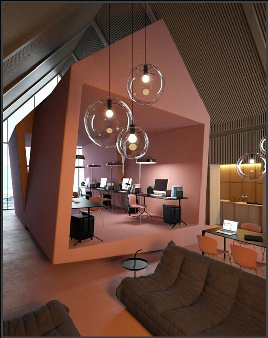 由上圖可以看出,設(shè)計師把所有的功能區(qū)簡潔有序地聯(lián)系在一起,粉紅色的顏料涂刷在上面,顯得格外入眼,藝術(shù)化。又增加了辦公室的木質(zhì)線條圍繞墻身和天花,環(huán)境氛圍霎時間就不同了,美化了空間,它的藝術(shù)魅力一下子就迸發(fā)出來了。